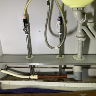 キッチンシンク下の収納スペースに水が溜まっている状況とのことで、点検にお伺いさせて頂きました。